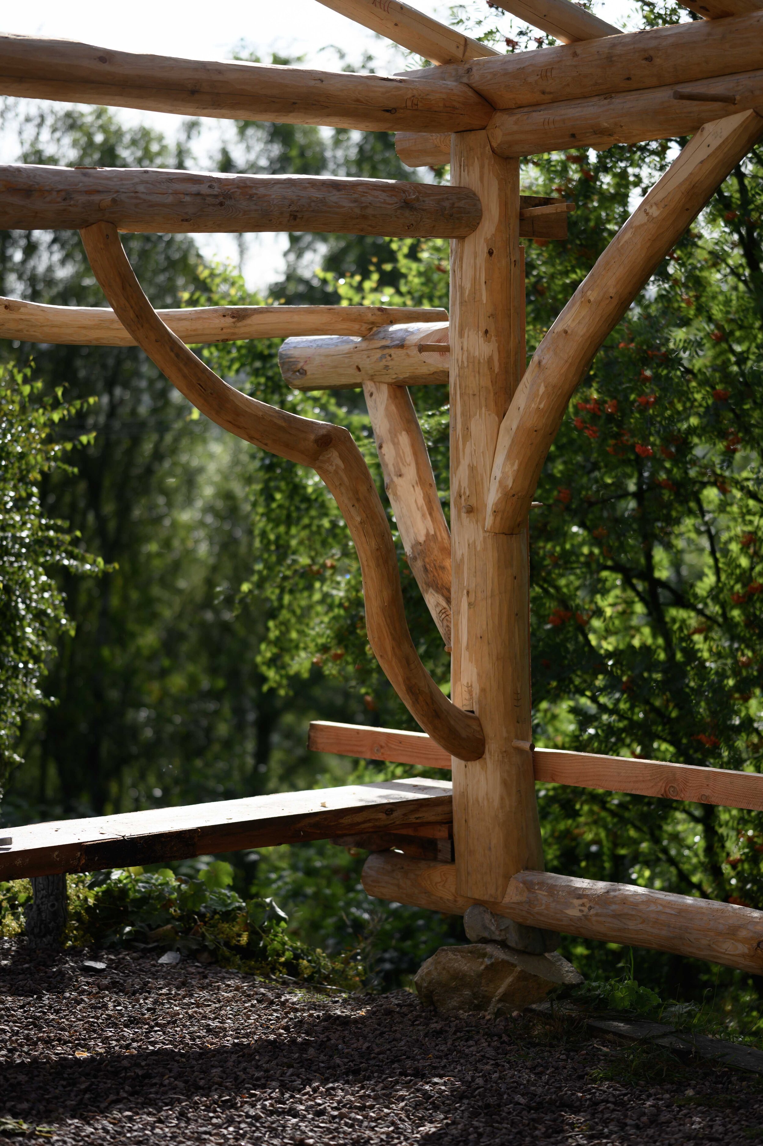 Custom offices and workshops can be built to any size or shape and designed to fit into whatever space you have available. They can have a mix of open sided and enclosed spaces and have large overhangs or extended porches to offer more dry storage space. The sturdy structure can support a turf roof and thus even large buildings can blend into a landscape. Take full advantage of the natural curved beauty of logs using curved log braces.
